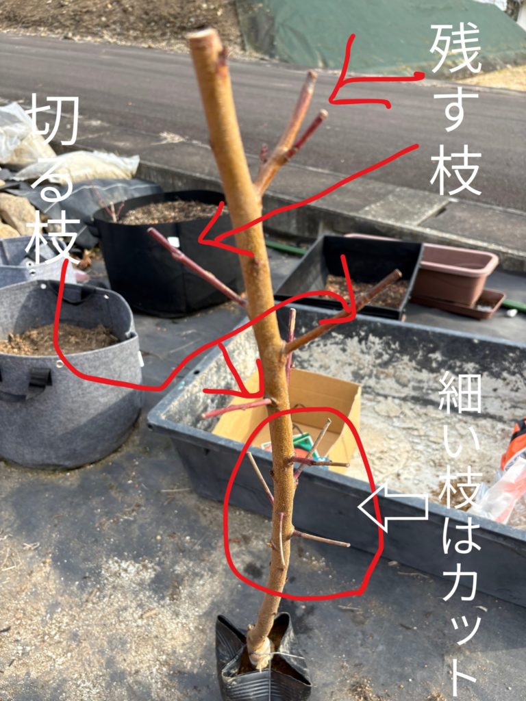 - 細い枝は成長しても太く元気な枝になりにくいのでカットします